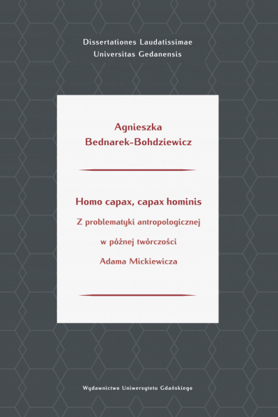 Tytuł Homo capax, capax hominis – odnoszący się do dwóch z trzech głównych idei zaczerpniętych z myśli poety – ma podpowiedzieć, że Mickiewiczowski projekt antropologii, o której mowa w podtytule, opiera się na teologii. By to wyeksponować, poddałam analizie jego twórczość z lat 30. i 40. XIX w. Są to głównie Zdania i uwagi (tworzone w latach 1833–1835, opublikowane w 1836 i 1844), które odczytuję jako świadectwo dróg duchowych Mickiewicza oraz wyłaniającej się z tych poetyckich przemyśleń jego rozwojowej religijności. To one są podstawowym materiałem, któremu się przyglądam i przez który patrzę na całokształt pracy twórczej polskiego romantyka. Uznaję je za zwieńczenie jego poszukiwań, ale i stylistyczny przełom, gdyż sposobem realizacji różnią się znacząco od innych utworów (formą zbliżone są do nich już tylko liryki lozańskie).