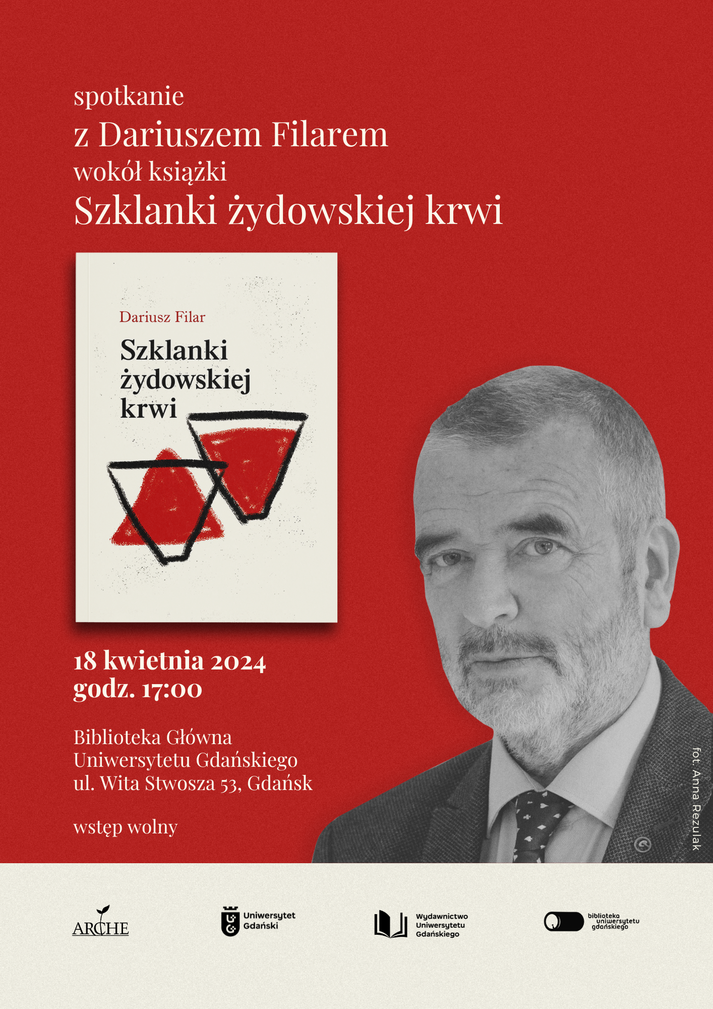 Uniwersytet Gdański, Wydawnictwo Arche i Wydawnictwo Uniwersytetu Gdańskiego zapraszają na promocję książki Szklanki żydowskiej krwi autorstwa Dariusza Filara, która odbędzie się 18 kwietnia 2024 o godz. 17:00 w Bibliotece Uniwersytetu Gdańskiego. Spotkanie poprowadzi dziennikarka TVP Gdańsk, Hanna Kordalska-Rosiek.